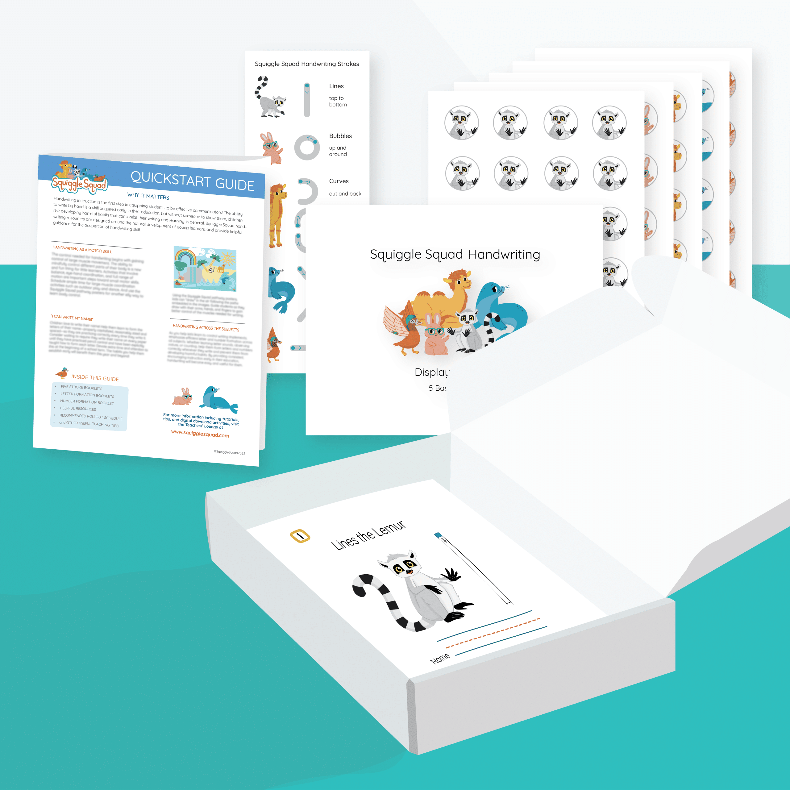 The Comprehensive Classroom Kit includes all of the teacher tools, student resources, and classroom visuals needed to teach letter and number formation. The kit includes helpful resources such as posters for large motor skill development, practice booklets, stroke display cards, and more. Teachers also get access to the Squiggle Squad Teachers’ Lounge where they will find more ideas and support.