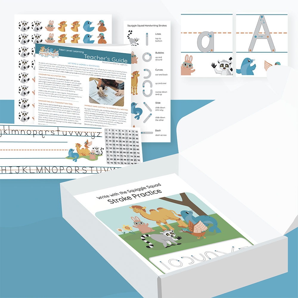 The Next Level Learning 1 Comprehensive Bundle includes all of the teachers’ tools, and student resources needed to review and practice letter and number formation. The bundle includes helpful resources such as a teacher guide, practice booklets, Morning Minute Letter Practice, and more. Teachers also get access to the Squiggle Squad Teachers’ Lounge where they will find digital downloads for year-round practice, activity ideas, and support. Recommended for first or second grade students.