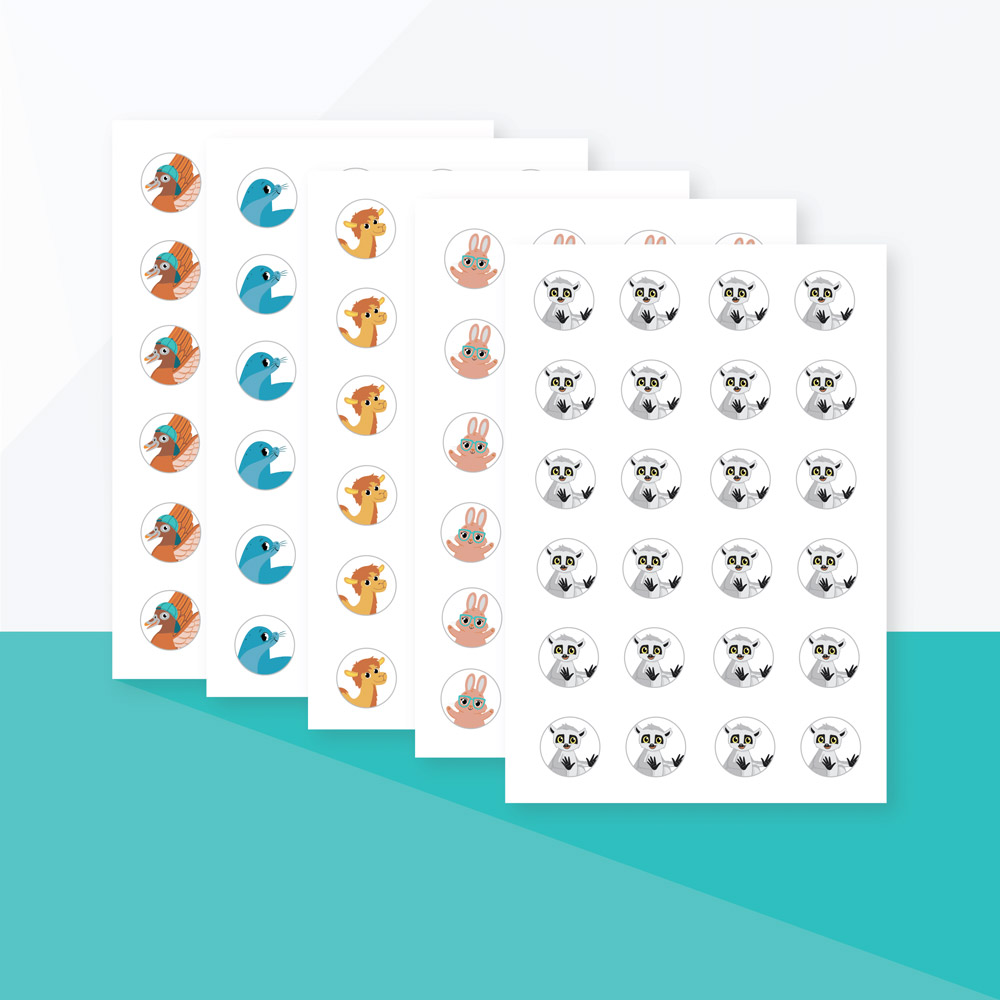 Includes a single sheet (63) 1” stickers of each of the five Squiggle Squad animal friends. Use to motivate and delight little learners.