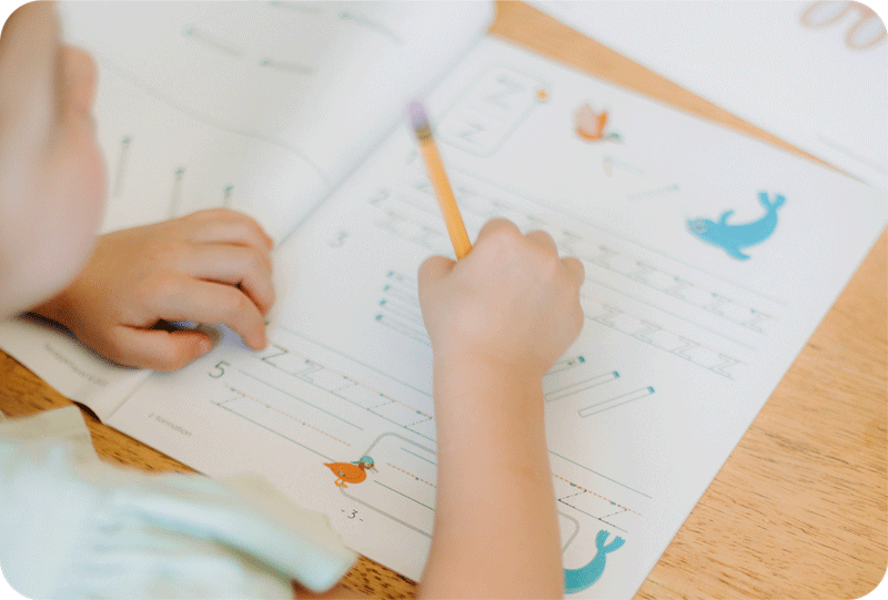 A young child writes in a workbook with a pencil while an adult guides their hand at a classroom table.